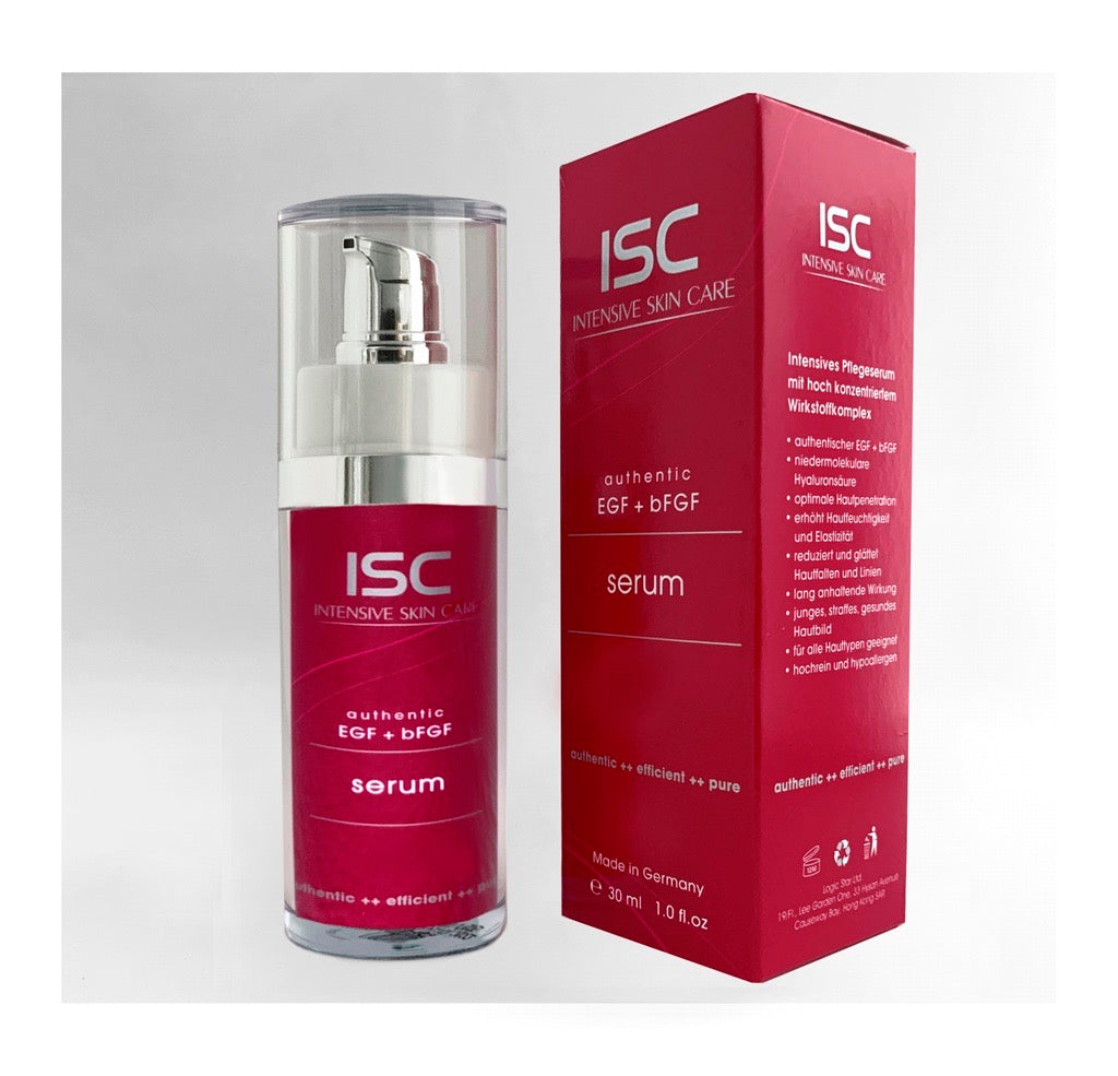 ISC products are particularly efficient thanks to their globally unique and patented manufacturing process for the main active ingredients EGF and bFGF, in which our scientists have succeeded in replicating both cell activators from the human original and stabilizing them in a serum and a cream. We therefore speak of authentic active ingredients. These are responsible for healthy cell development and cell regeneration, which decreases from the age of about 27 years. ISC products make these most important, body-identical proteins available to the skin cells again, and thus counteract the visible aging process in a targeted and completely natural way.